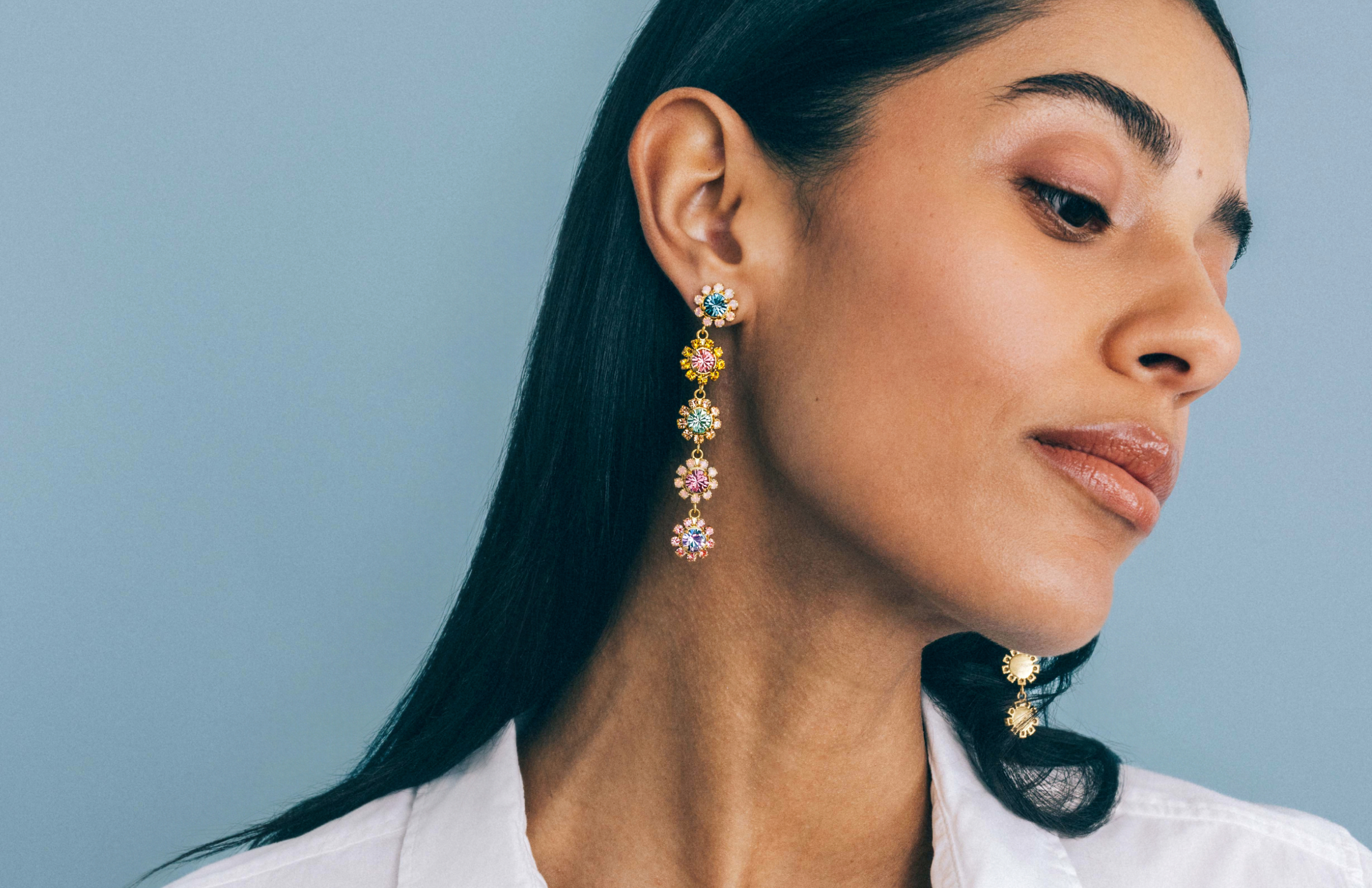 The Alora Drops: Five crystal flowers in various color combinations make up these delightfully asymmetrical strands that move as you move