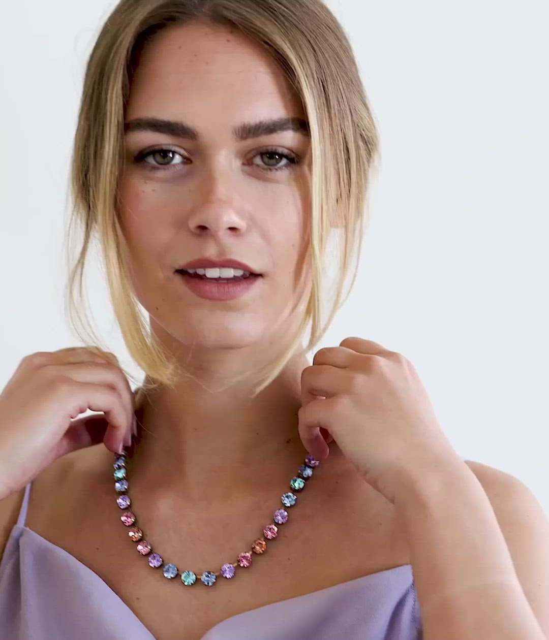The Arista Slider Necklace features our signature slider clasp for easy on-and-off. Easily adjustable in various lengths. Features hand-set glass crystals, an adjustable slider clasp, and an 18K antiqued gold finish.