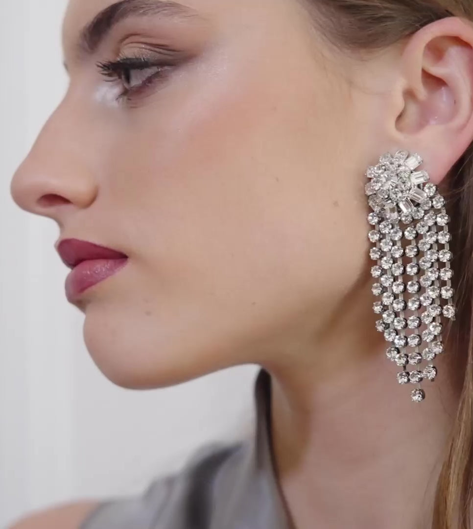 Features hand-set crystal stones, a shiny silver finish over brass, and clip-on earring backs.