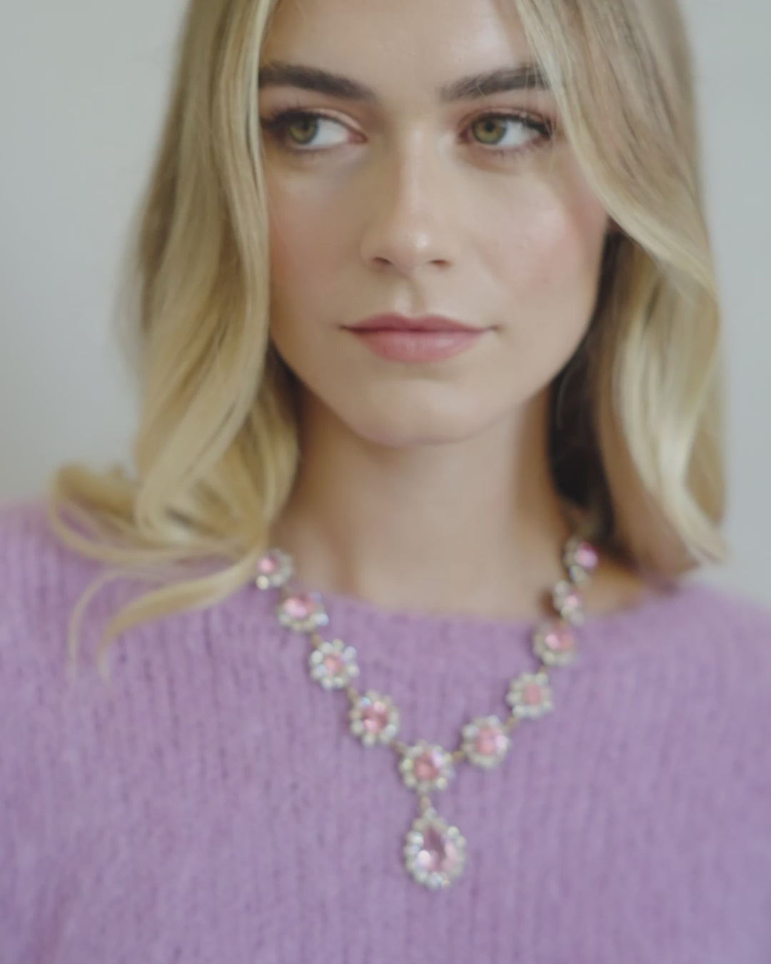 The Countess necklace is the ultra-feminine answer to this season’s grand statement. She is the definition of fabulous when paired with a plunging neckline but also dresses up a soft sweater for a more casual gathering.