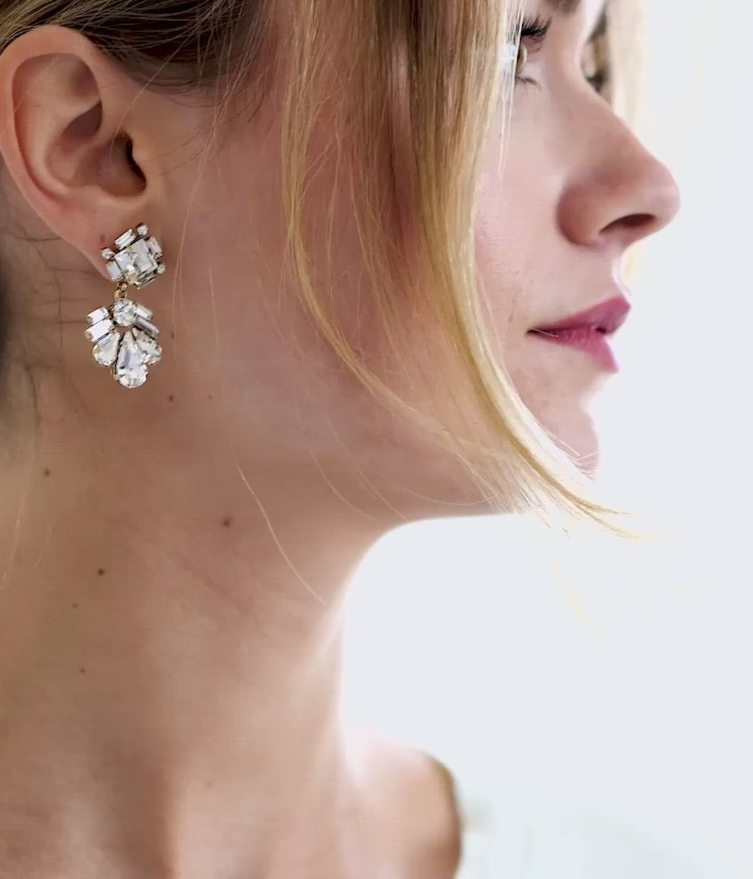 The Deco-inspired Eugenie Earrings are a must have drop style for any jewelry box. Features hand-set glass stones, an 18K antiqued gold finish and surgical steel posts.