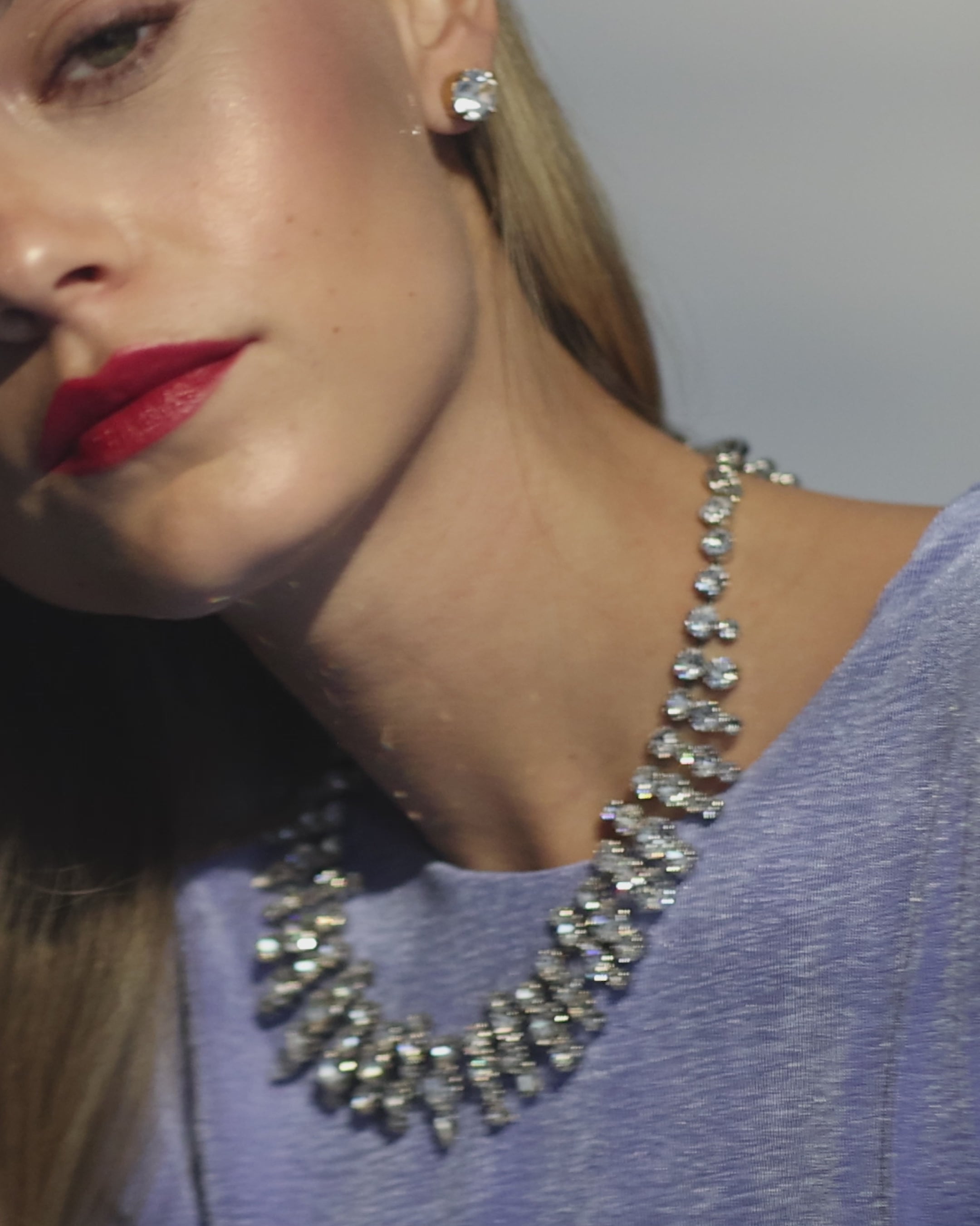 Steal the show in our newest crystal confection, Julietta. We love wearing this piece on the shortest length, up high on the neck for an unexpected, contemporary look. Worn with a crewneck, this necklace turns basics into a major moment.