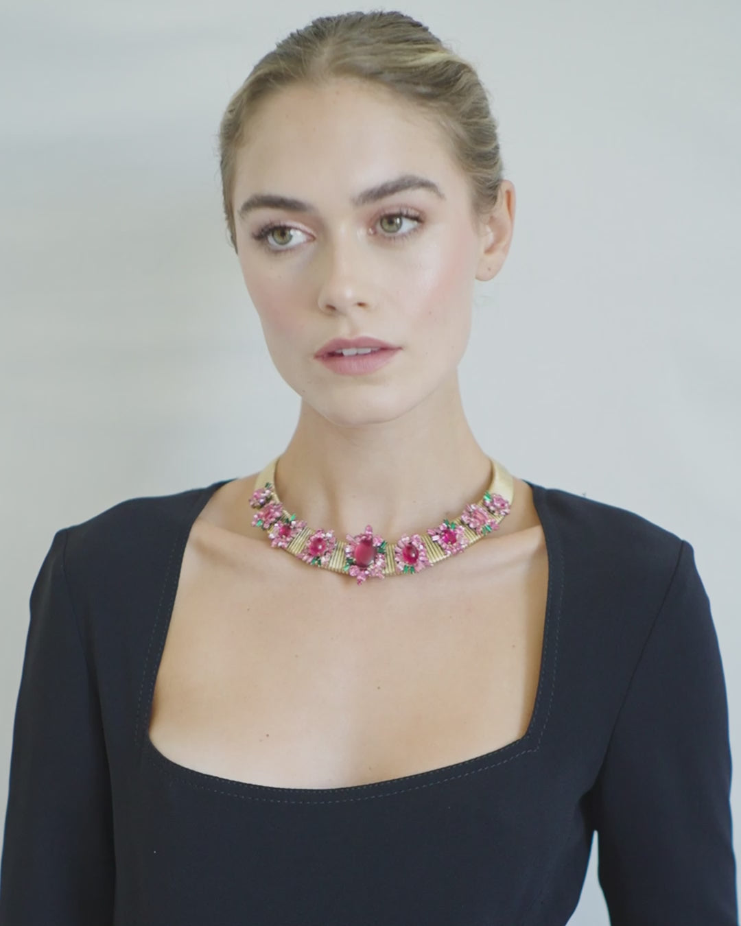 The star of this holiday’s Rose suite is undeniably the statement necklace. Nine lush ruby, pink and green roses speak for themselves as they sit atop a vintage-inspired cobra chain collar for a decadent 80’s mood.